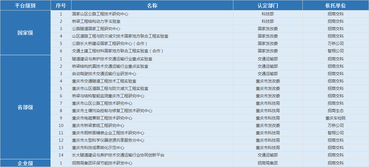招商交科是國家級交通行業(yè)科技創(chuàng)新基地,建有國家級、省部級重點(工程)實驗室和工程(技術)研究中心等各級、各類研究開發(fā)平臺21個,其功能覆蓋了產業(yè)鏈中的基礎研究、應用研究、技術開發(fā)、技術轉移、工程化和產業(yè)化等多個環(huán)節(jié),有力支撐了公路交通行業(yè)各項專業(yè)技術的發(fā)展,構建了集約高效的科技創(chuàng)新體系。