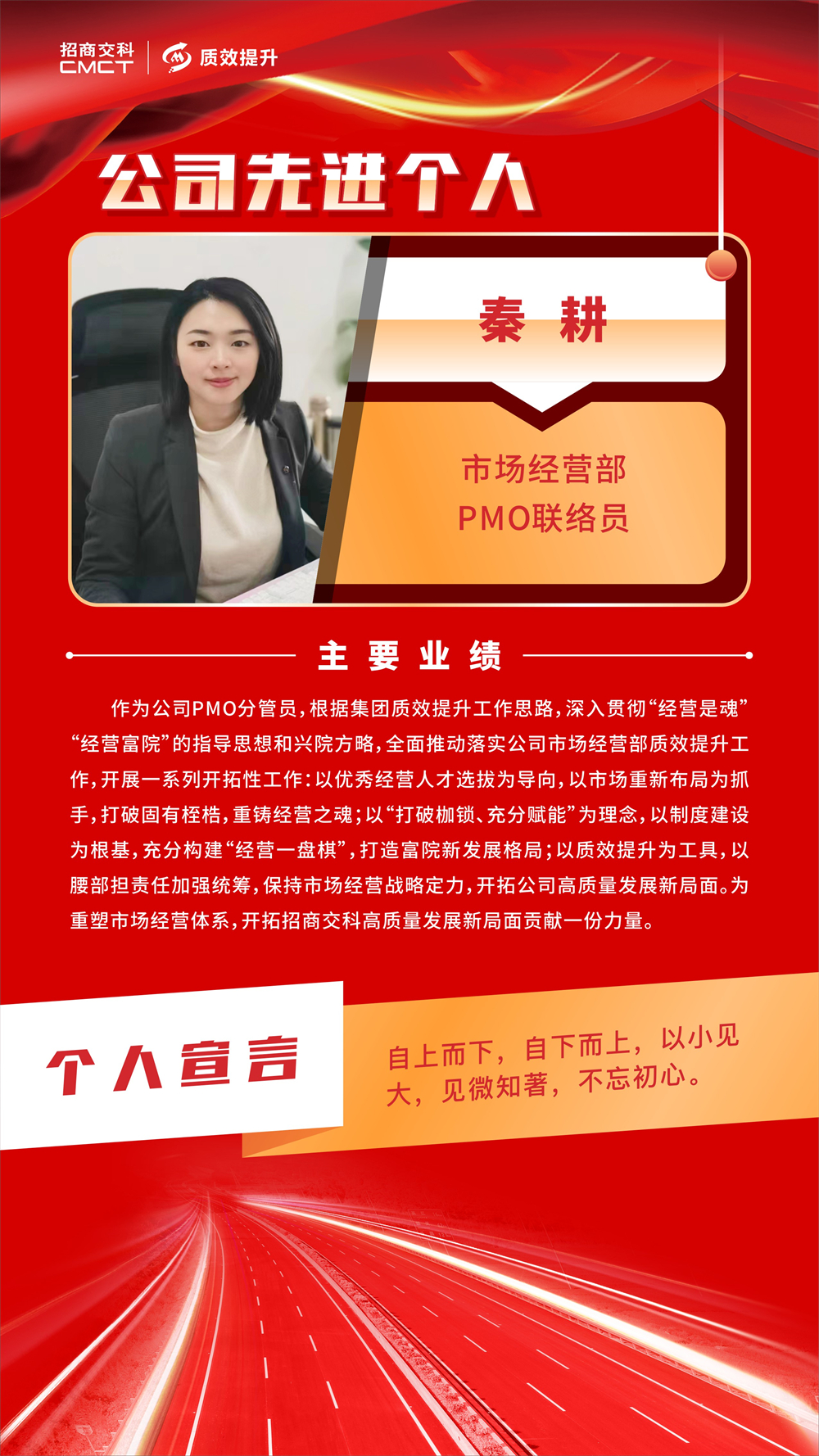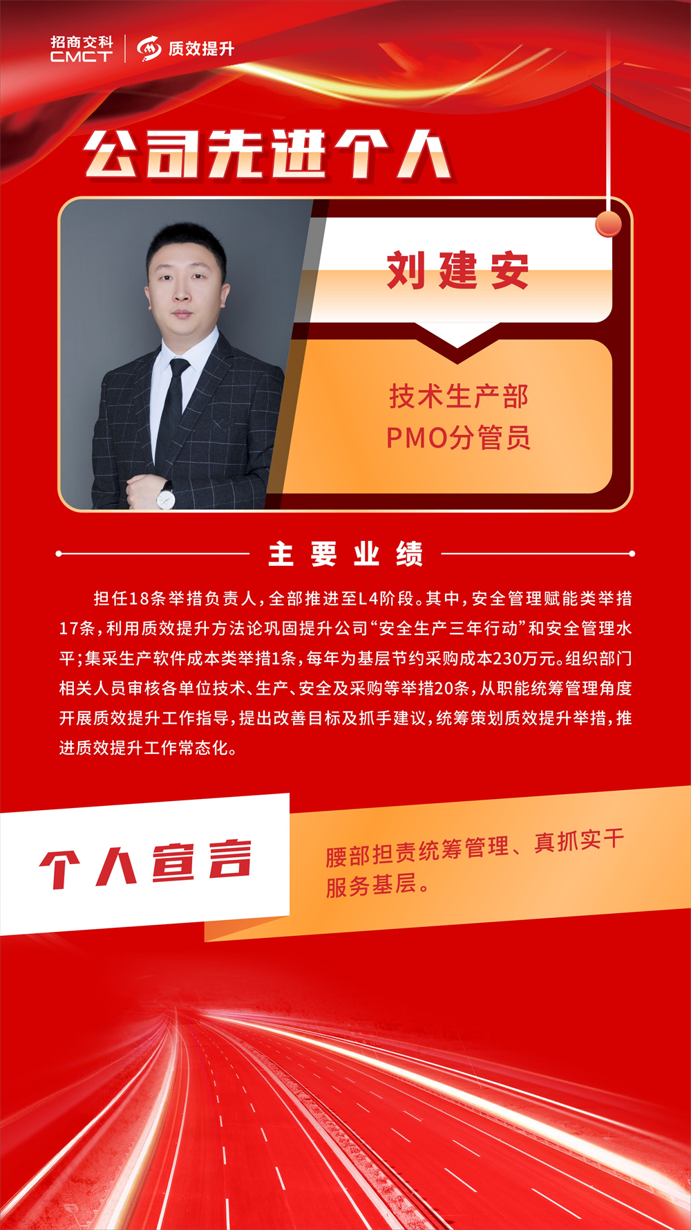 ? 各部門和單位要以先進單位、先進個人為榜樣,堅定不移推動質(zhì)效提升工作走深走實,助力招商交科高質(zhì)量發(fā)展。