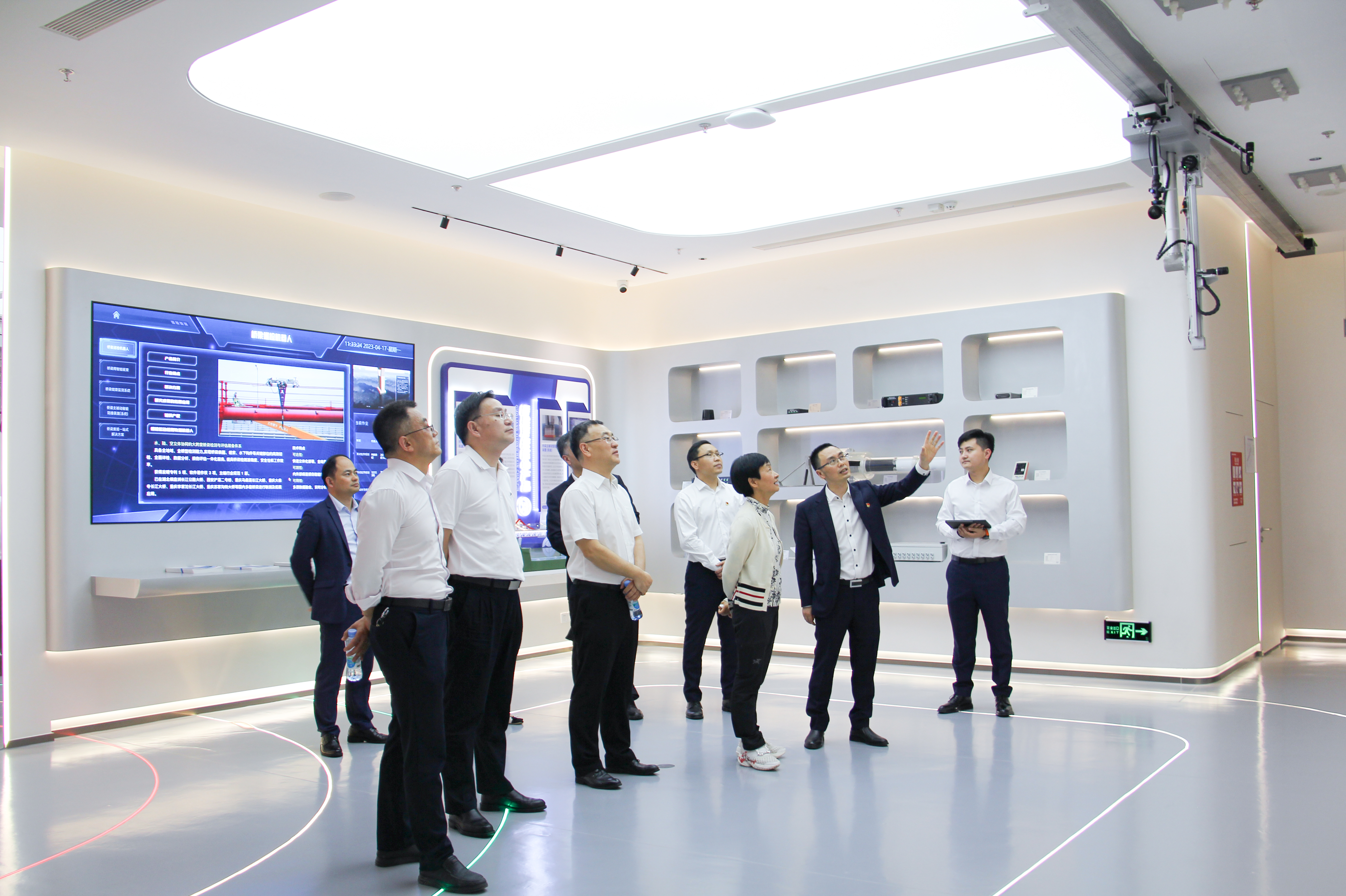 段湘暉詳細考察了重慶曾家?guī)r大橋工程項目(以下簡稱:曾家?guī)r項目)及曾家?guī)r公司科技展館,聽取曾家?guī)r項目建設(shè)過程、科研規(guī)劃、成果應(yīng)用、運營維護等情況匯報,對展館中陳列展示的“交通智慧運維平臺”“橋梁巡檢機器人”“隧道巡檢機器人”“公路隧道運營與安全培訓(xùn)VR互動體驗”等創(chuàng)新成果給予好評。