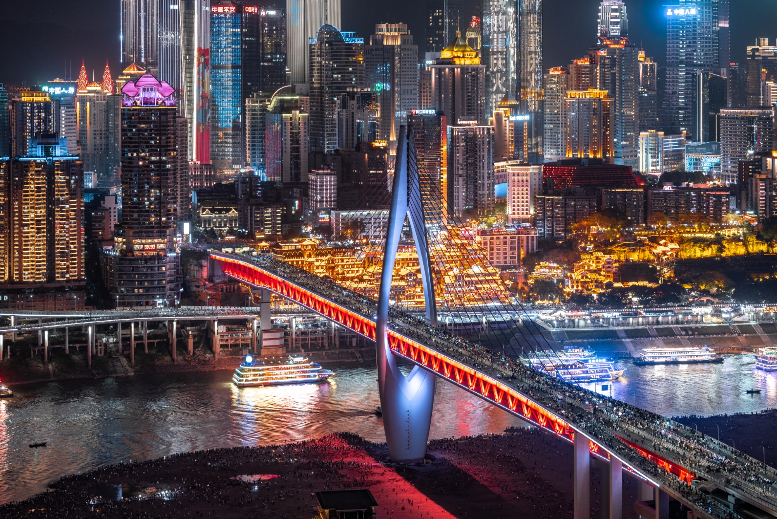 重慶兩江橋(千廝門嘉陵江大橋、東水門長(zhǎng)江大橋)項(xiàng)目包含兩橋一隧,位于重慶中心城區(qū),路線穿越重慶最繁華的兩江四岸以及CBD渝中半島,跨越了最具重慶特色的著名景點(diǎn)以及旅游人群最多的濱江路,成為連接兩江四岸的重要交通大動(dòng)脈。兩江橋設(shè)計(jì)建設(shè)過(guò)程中,特別成立了兩江大橋景觀設(shè)計(jì)專項(xiàng),這也是重慶主城區(qū)橋梁首次成立景觀專項(xiàng),集合了橋梁工程、美學(xué)、環(huán)境藝術(shù)、道路規(guī)劃、智慧交通等專業(yè)技術(shù)門類,開創(chuàng)橋梁景觀打造之先河。全方位的展示了“橋都印象”。