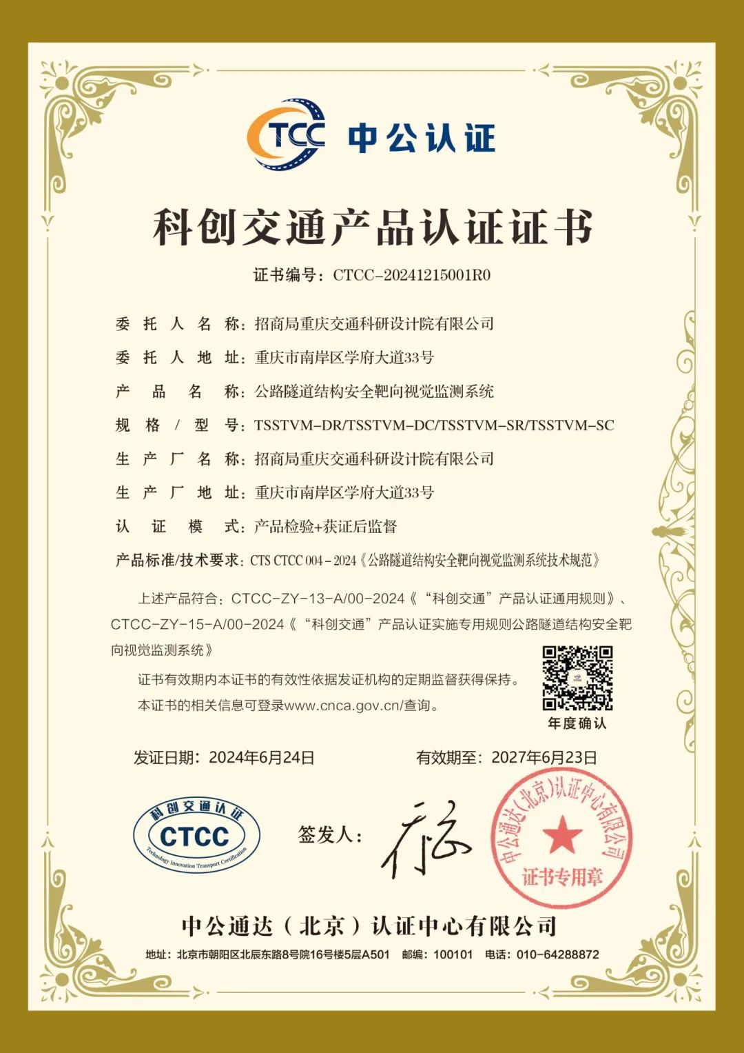 中國公路學會副秘書長、中公認證董事長喬云向招商交科隧道與地下工程研究院副院長胡居義頒發(fā)了認證證書,發(fā)布儀式現(xiàn)場播放了國工中心科技產(chǎn)品視頻宣傳片,吸引了行業(yè)和媒體廣泛關(guān)注。