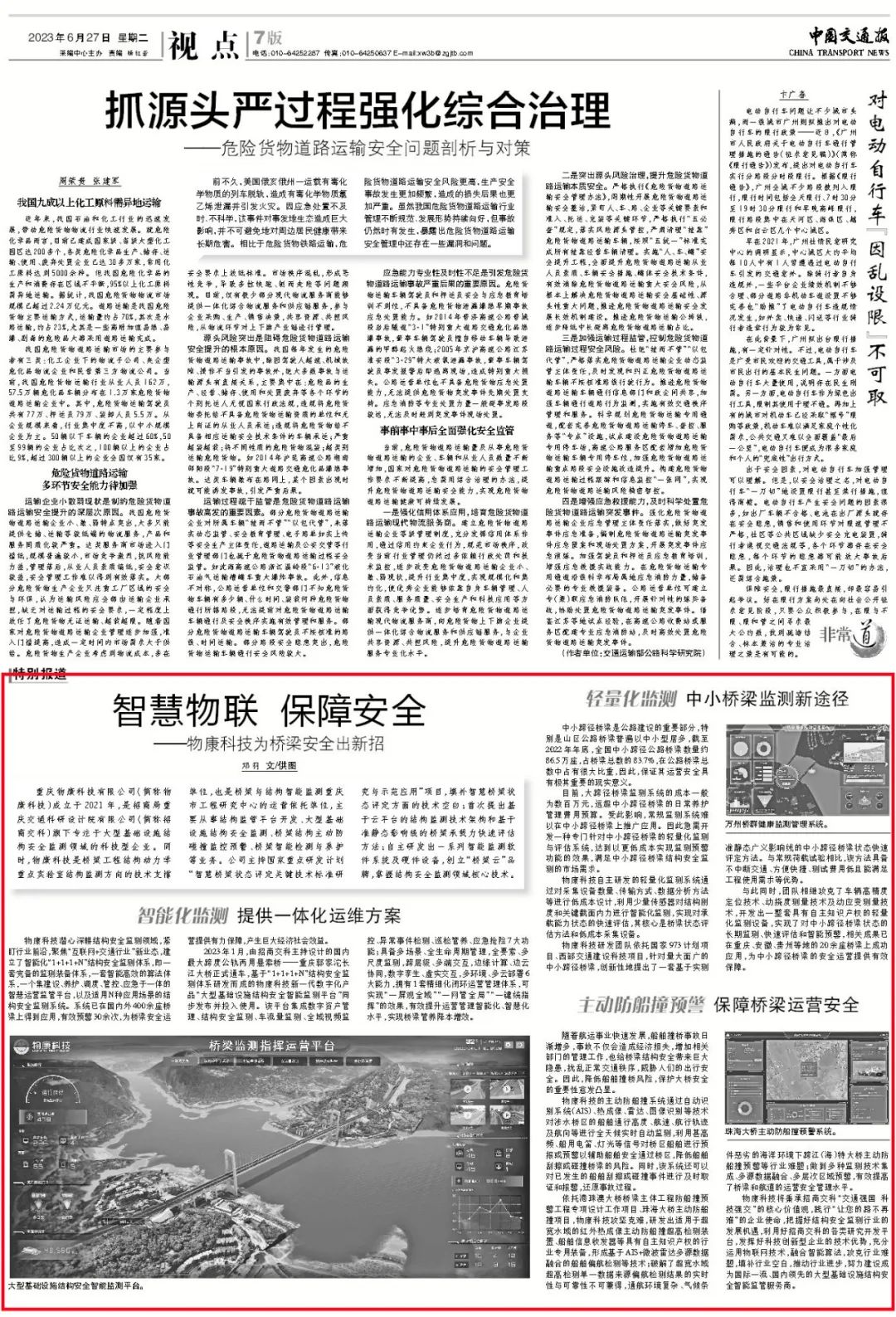 6月27日,在物康科技成立2周年之際,《中國交通報(bào)》在第七版和微信公眾號(hào)全文刊發(fā)了文章《智慧物聯(lián) 保障安全——物康科技為橋梁安全出新招》。文章詳細(xì)介紹了物康科技在結(jié)構(gòu)監(jiān)管平臺(tái)開發(fā)、大型基礎(chǔ)設(shè)施結(jié)構(gòu)安全監(jiān)測(cè)、橋梁結(jié)構(gòu)主動(dòng)防碰撞監(jiān)控預(yù)警、橋梁智能檢測(cè)與養(yǎng)護(hù)等領(lǐng)域的技術(shù)和能力。現(xiàn)將全文轉(zhuǎn)載如下: