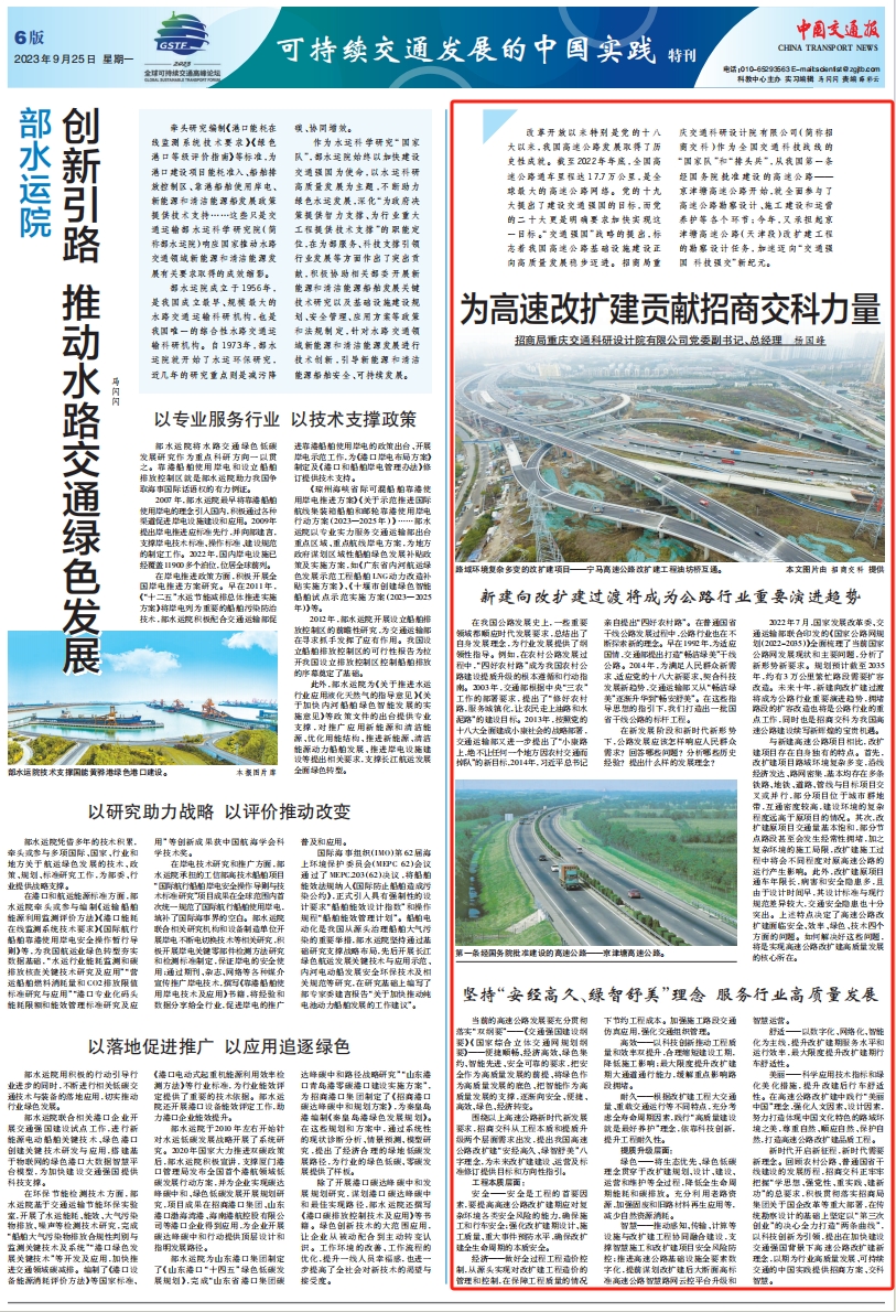 9 月 25 日,《中國交通報》在第六版《可持續(xù)交通發(fā)展的中國實踐》特刊,全文刊發(fā)了招商交科黨委副書記、總經(jīng)理楊國峰的署名文章《為高速改擴(kuò)建貢獻(xiàn)招商交科力量》。