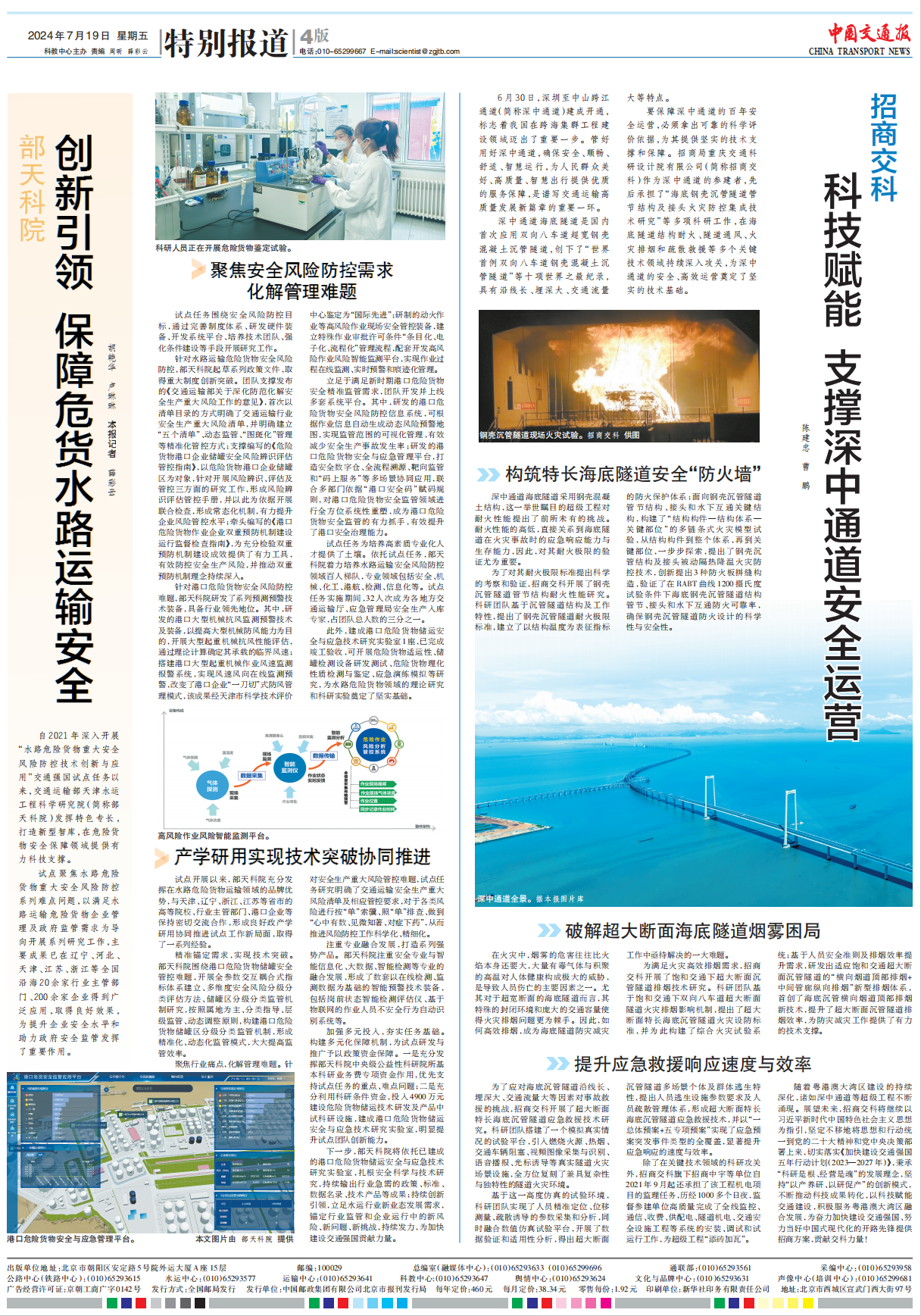 7月19日,《中國交通報》在第四版“特別報道”刊發(fā)了《招商交科:科技賦能 支撐深中通道安全運營》文章,介紹了招商交科作為深中通道的參建單位之一,在海底隧道結(jié)構(gòu)耐火、隧道通風(fēng)、火災(zāi)排煙和疏散救援等技術(shù)攻關(guān)方面作出的貢獻。現(xiàn)將全文轉(zhuǎn)載如下: