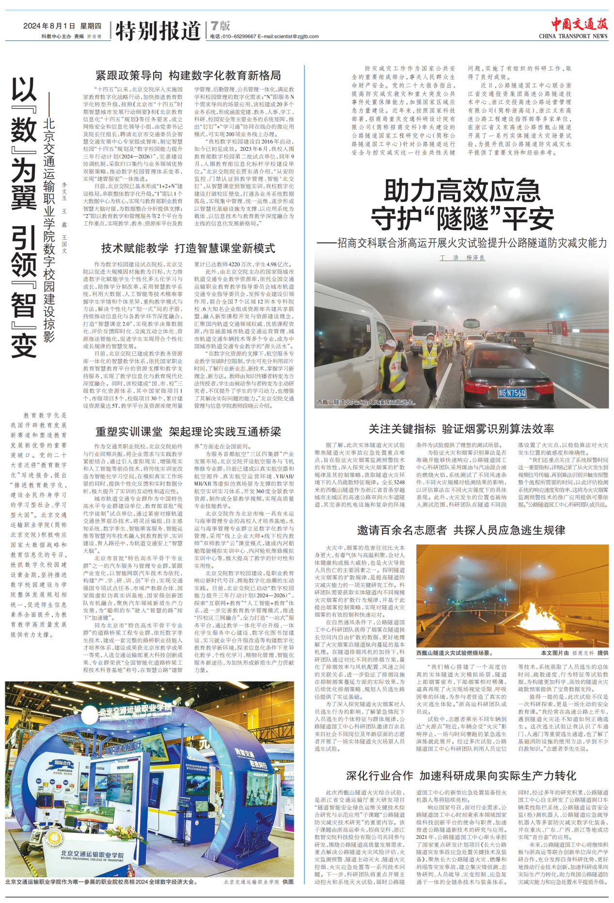 8月1日,《中國(guó)交通報(bào)》“特別報(bào)道”刊發(fā)了《助力高效應(yīng)急 守護(hù)“隧隧”平安——招商交科聯(lián)合浙高運(yùn)開(kāi)展火災(zāi)試驗(yàn)提升公路隧道防災(zāi)減災(zāi)能力》文章。在當(dāng)前國(guó)家高度重視公共安全與防災(zāi)減災(zāi)工作的背景下,公路隧道作為交通運(yùn)輸?shù)闹匾ǖ?,其安全與防災(zāi)能力直接關(guān)系到人民群眾的生命財(cái)產(chǎn)安全。招商交科聯(lián)合多家單位,在浙江省義東高速公路西甑山隧道開(kāi)展了一系列火災(zāi)試驗(yàn),旨在提升我國(guó)公路隧道防災(zāi)減災(zāi)水平,守護(hù)公共安全?,F(xiàn)將全文轉(zhuǎn)載如下: