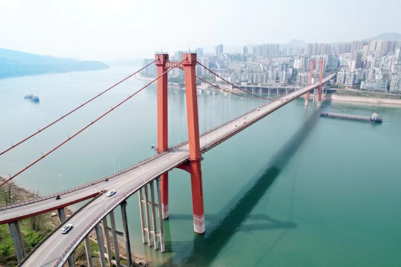 忠縣長江大橋全長1199.73m,主橋?yàn)閱慰缂觿盆旒芰簯宜鳂颍鐝綖?60m,索塔高度分別為153.3m和142.3m,是重慶長江上第二座懸索橋,至今已“服役”22年。為保障橋梁運(yùn)營安全和提高結(jié)構(gòu)耐久
