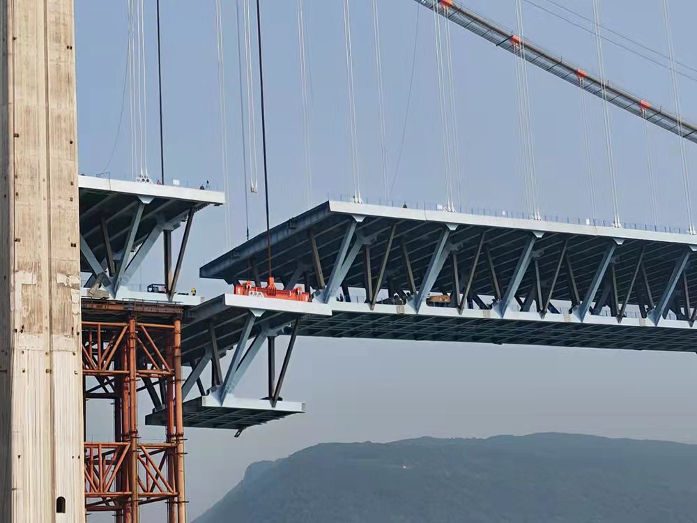 在大橋建造關(guān)鍵技術(shù)上,作為大跨徑公軌兩用橋梁,如何滿足軌道剛度指標(biāo)要求是橋梁設(shè)計(jì)的重點(diǎn),更是難點(diǎn)。招商交科設(shè)計(jì)項(xiàng)目組根據(jù)橋位處實(shí)際地形條件,經(jīng)過多方案比選及論證,創(chuàng)新性提出采用“單孔懸吊雙塔三跨連續(xù)”的結(jié)構(gòu)體系,在不增加橋梁造價(jià)的前提下,巧妙解決了軌道剛度要求高等技術(shù)難題,使公軌兩用橋采用大跨度懸索橋成為可能,為類似工程的設(shè)計(jì)提供了寶貴經(jīng)驗(yàn)。