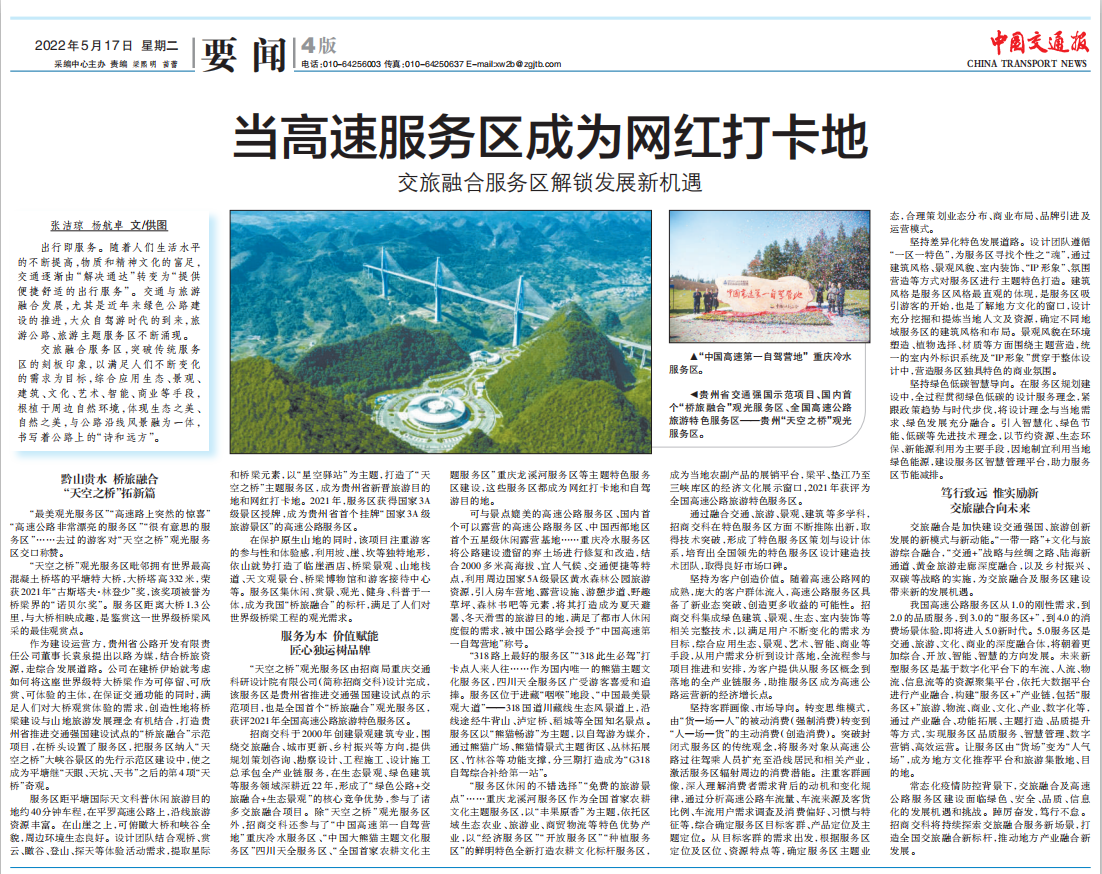 當天的《中國交通報》還以《當高速服務(wù)區(qū)成為網(wǎng)紅打卡地——交旅融合服務(wù)區(qū)解鎖發(fā)展新機遇》為題刊發(fā)專題報道,詳細介紹招商交科探索交旅融合發(fā)展之路。