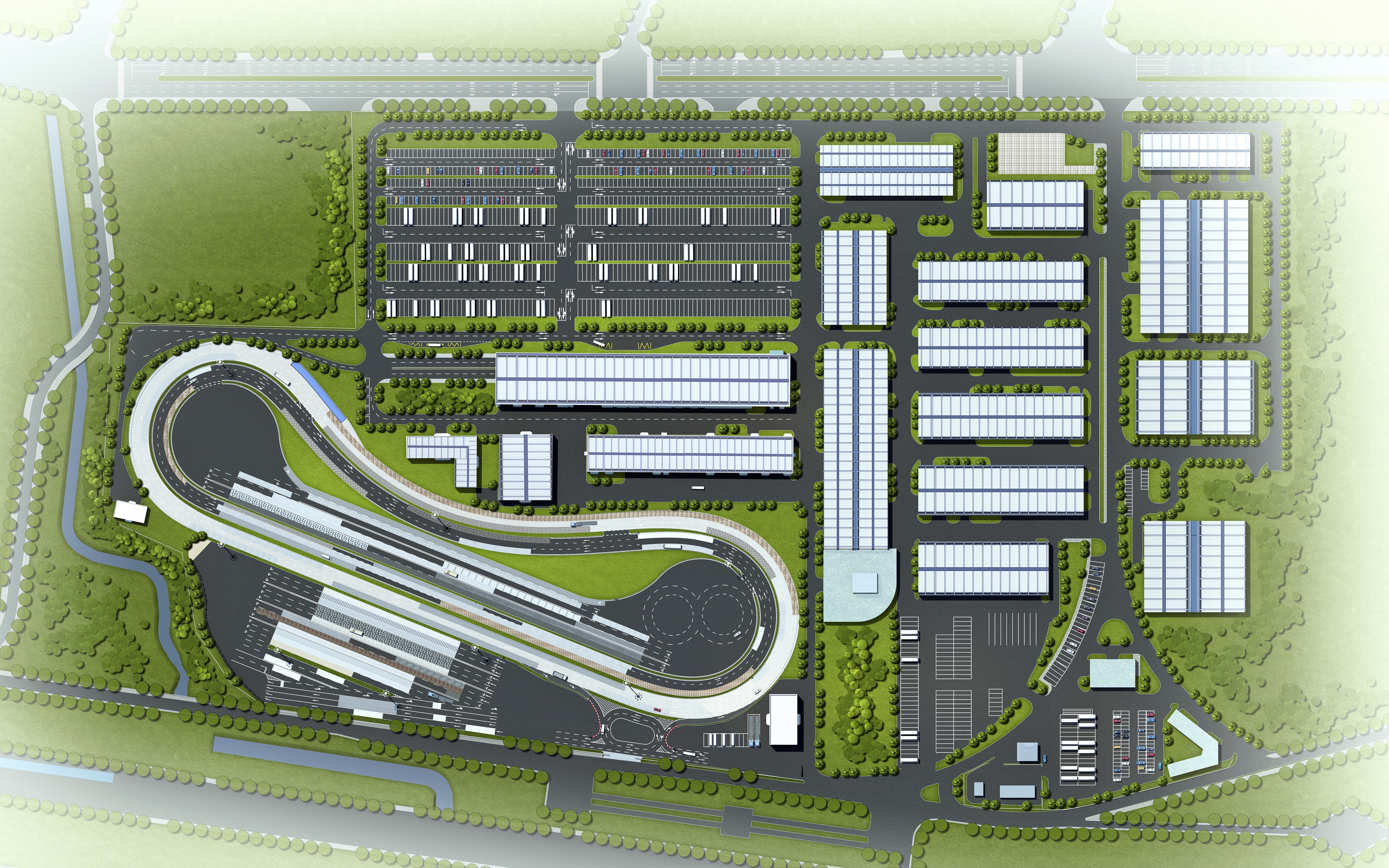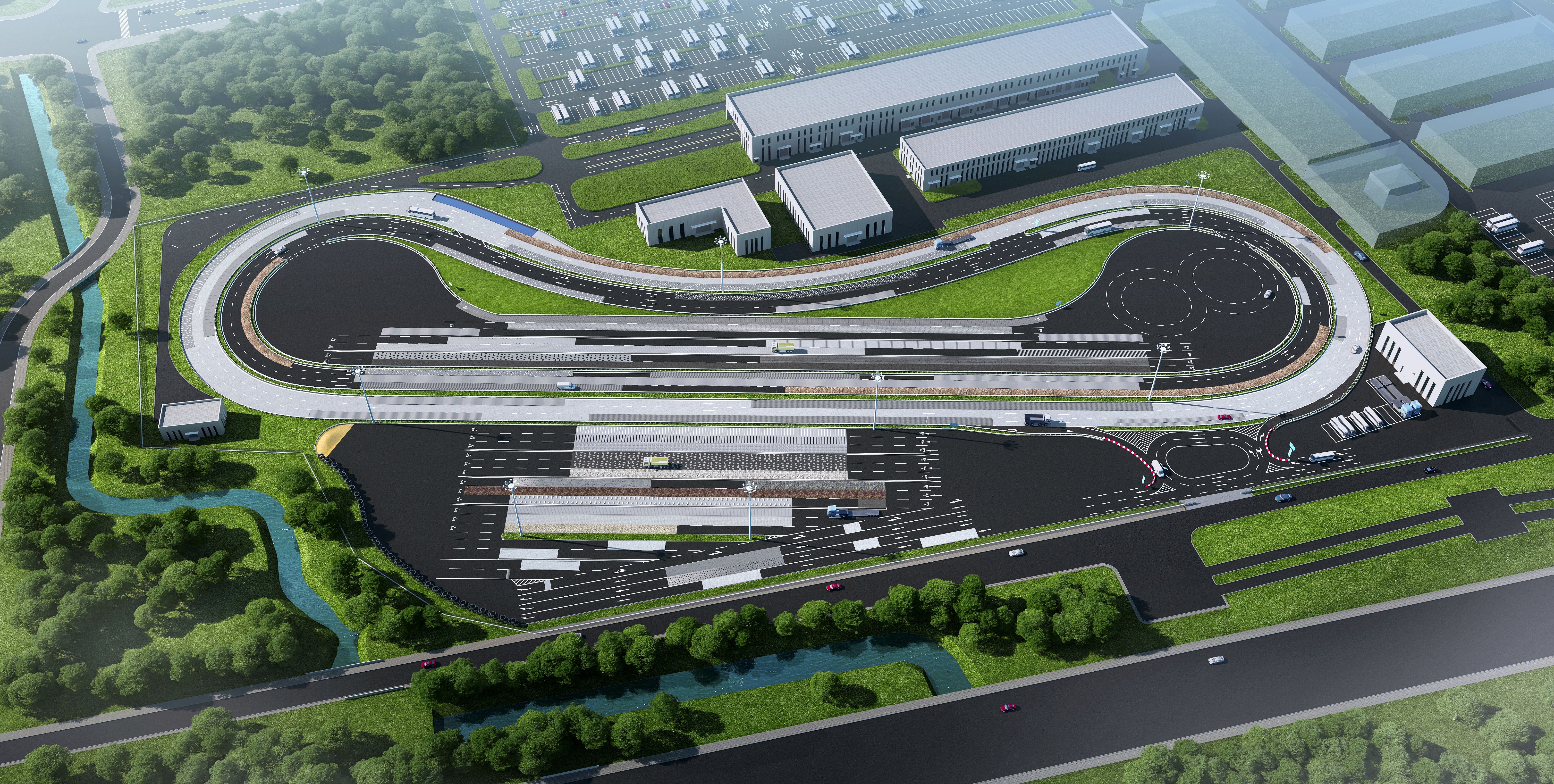 車檢院二期效果圖(鳥瞰圖) 新能源智能網(wǎng)聯(lián)汽車及智慧交通科技創(chuàng)新基地位于重慶市高新技術(shù)產(chǎn)業(yè)開發(fā)區(qū)金鳳電子信息產(chǎn)業(yè)園,總占地總面積16.76萬㎡,其中試驗道路占地7.89萬㎡,包括氣囊誤作用試驗道路、NVH評價試驗道路、強化耐久試驗道路等3個區(qū)域,涉及比利時路、維也納路、坑洼路、扭曲路、搓板路、波形路、顛簸路、凸塊路、魚鱗坑、卵石路等50多種特種道路。項目建成后,將用于汽車和摩托車新產(chǎn)品研究開發(fā)試驗、標(biāo)準(zhǔn)驗證及可靠性試驗、相關(guān)法規(guī)試驗等。