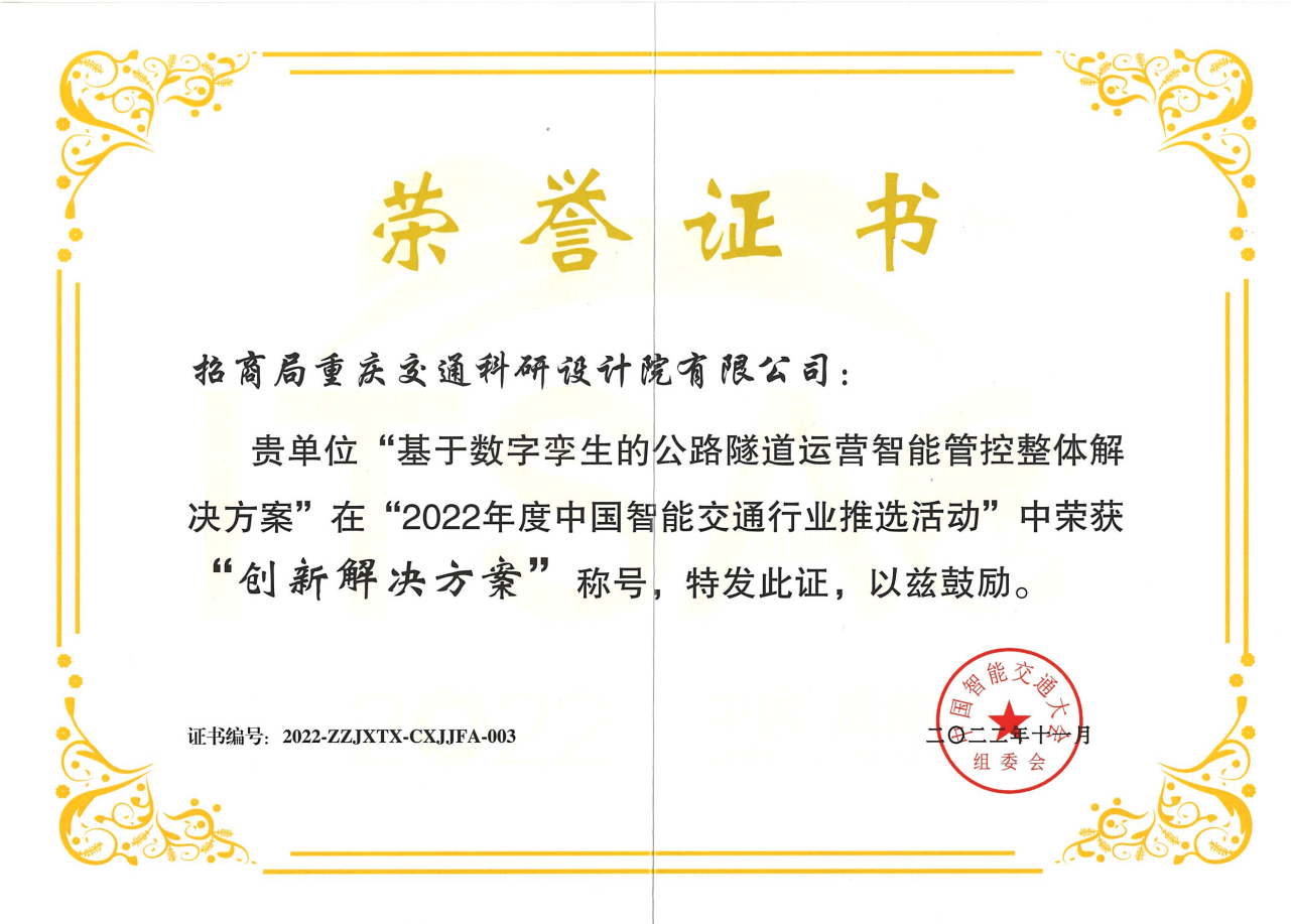 大會舉行了“2022年度中國智能交通協(xié)會科學技術(shù)獎”頒獎儀式和“2022年度中國智能交通行業(yè)推選活動”揭曉典禮,公司智能交通團隊參與申報的“基于數(shù)字孿生的特長隧道交通運行預(yù)警管控關(guān)鍵技術(shù)及應(yīng)用”榮獲2022年度中國智能交通協(xié)會科技進步獎三等獎;由公司推薦、數(shù)智研究院報送的創(chuàng)新解決方案和優(yōu)秀個人在行業(yè)推選活動中斬獲殊榮,其中擁有自主知識產(chǎn)權(quán)的創(chuàng)新成果“基于數(shù)字孿生的公路隧道運營智能管控整體解決方案”榮獲“創(chuàng)新解決方案”獎項,數(shù)智研究院科研開發(fā)中心副主任朱湧高級工程師獲“優(yōu)秀智能交通工程師”榮譽稱號。