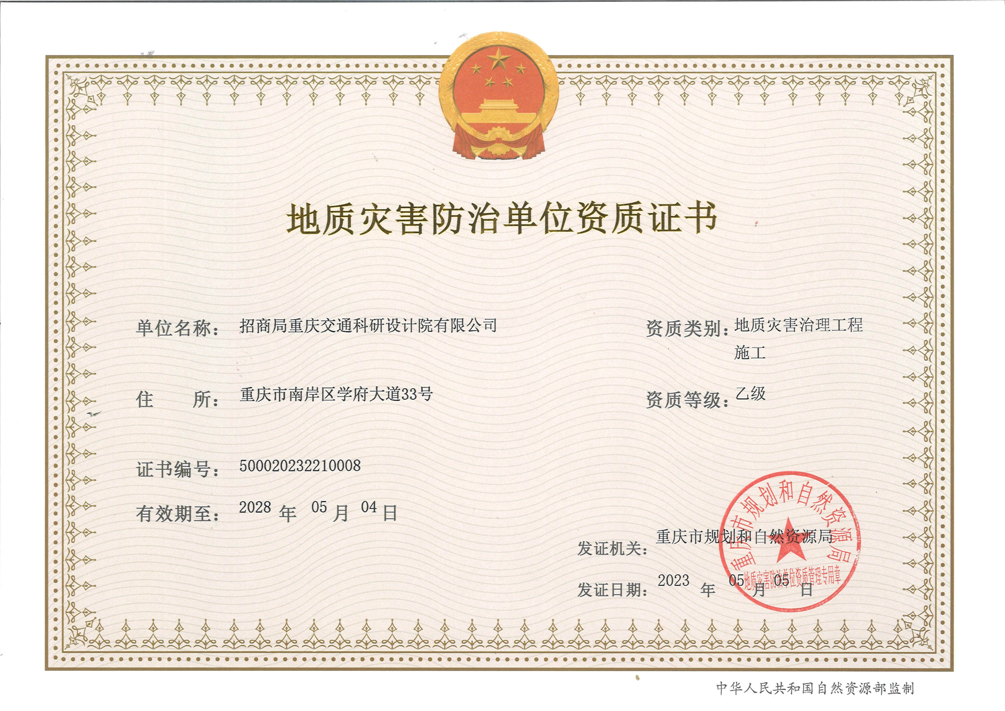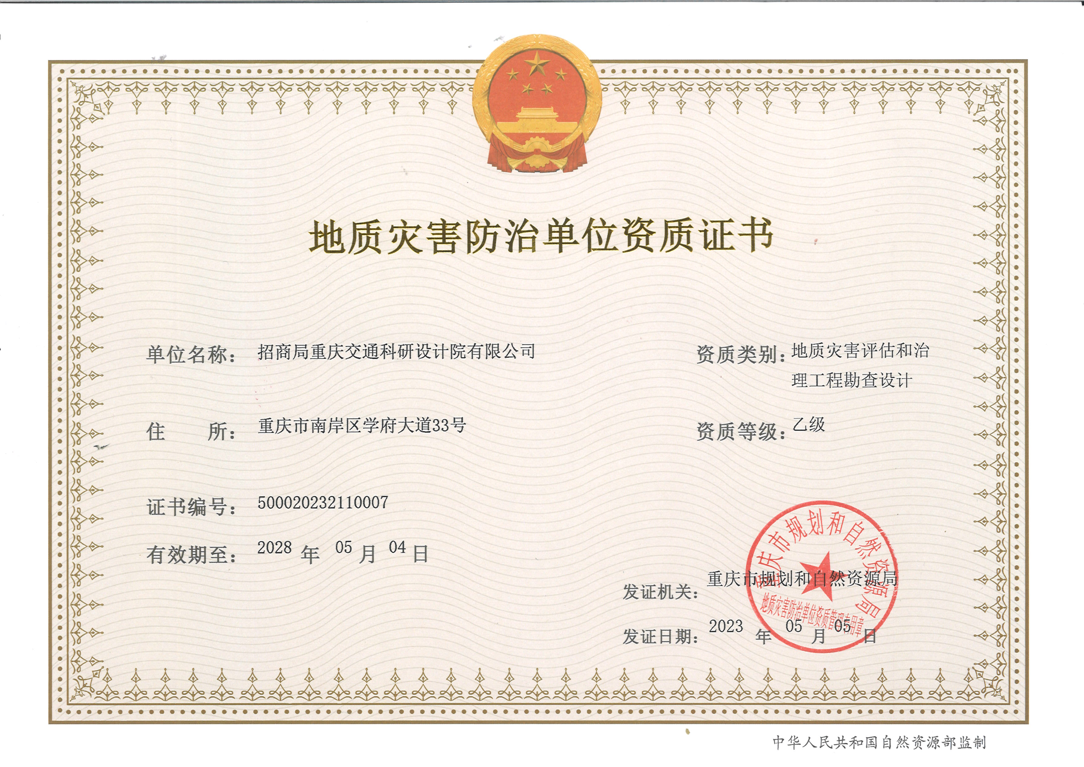 招商交科取得地質(zhì)災(zāi)害防治單位乙級資質(zhì)