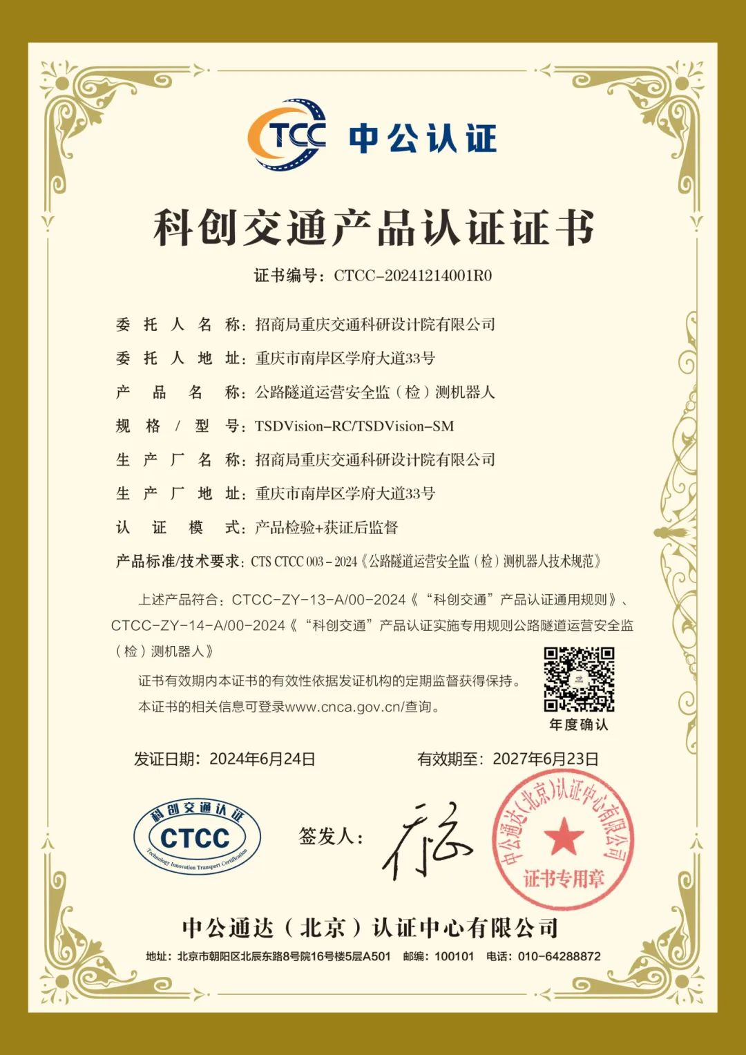 中國公路學會副秘書長、中公認證董事長喬云向招商交科隧道與地下工程研究院副院長胡居義頒發(fā)了認證證書,發(fā)布儀式現(xiàn)場播放了國工中心科技產(chǎn)品視頻宣傳片,吸引了行業(yè)和媒體廣泛關(guān)注。