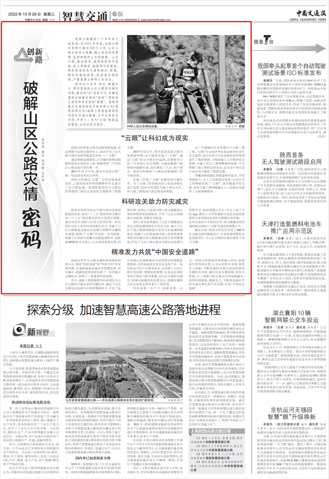 10月26日,《中國交通報》在第6版全文刊發(fā)道路研究院文章《破解山區(qū)公路災(zāi)情“密碼”》,文章介紹了招商交科始終立足專業(yè),堅持自主創(chuàng)新,加強防災(zāi)減災(zāi)前沿技術(shù)探索,強化信息支撐保障,加快大數(shù)據(jù)、人工智能與防災(zāi)減災(zāi)應(yīng)用深度融合;堅持科技賦能,精準(zhǔn)發(fā)力,不斷推進(jìn)新時代防災(zāi)減災(zāi)事業(yè)現(xiàn)代化發(fā)展,共同助力“中國安全道路”。現(xiàn)將全文轉(zhuǎn)載如下: