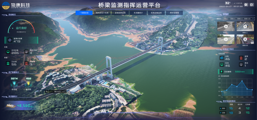 2023年1月,由招商交科主持設(shè)計(jì)的國內(nèi)最大跨度公軌兩用懸索橋——重慶郭家沱長江大橋正式通車,基于“1+1+1+N”結(jié)構(gòu)安全監(jiān)測(cè)體系研發(fā)而成的物康科技新一代數(shù)字化產(chǎn)品“大型基礎(chǔ)設(shè)施結(jié)構(gòu)安全智能監(jiān)測(cè)平臺(tái)”同步發(fā)布并投入使用。該平臺(tái)集成數(shù)字資產(chǎn)管理、結(jié)構(gòu)安全監(jiān)測(cè)、車流量監(jiān)測(cè)、全域視頻監(jiān)控、異常事件檢測(cè)、巡檢管養(yǎng)、應(yīng)急搶險(xiǎn)7大功能;具備多場(chǎng)景、全生命周期管理,全要素、多尺度監(jiān)測(cè),跨層級(jí)、多端交互,邊緣計(jì)算、邊云協(xié)同,數(shù)字孿生、虛實(shí)交互,多環(huán)境、多云部署6大能力,擁有1套精細(xì)化閉環(huán)運(yùn)營管理體系,可實(shí)現(xiàn)“一屏觀全域”“一網(wǎng)管全局”“一鍵統(tǒng)指揮”的效果,有效提升運(yùn)營管理智能化、智慧化水平,實(shí)現(xiàn)橋梁管養(yǎng)降本增效。
