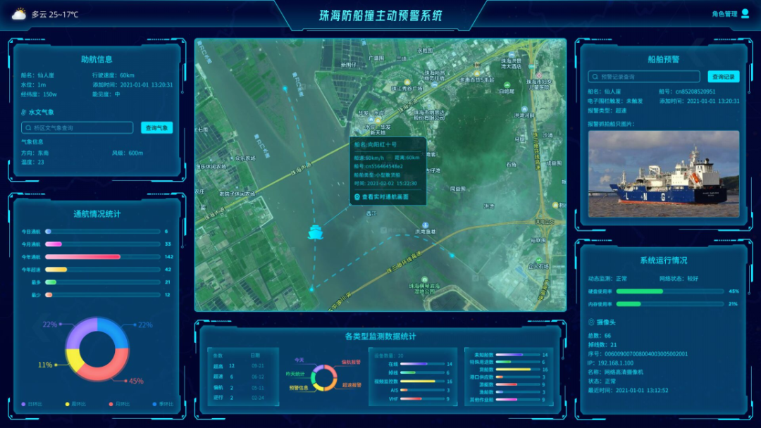 物康科技的主動(dòng)防船撞系統(tǒng)通過自動(dòng)識(shí)別系統(tǒng)(AIS)、熱成像、雷達(dá)、圖像識(shí)別等技術(shù)對(duì)涉水橋區(qū)的船舶通行高度、航速、航行軌跡及航向等進(jìn)行全天候?qū)崟r(shí)自動(dòng)監(jiān)測(cè),利用甚高頻、船用電笛、燈光等信號(hào)對(duì)橋區(qū)船舶進(jìn)行預(yù)報(bào)或預(yù)警以輔助船舶安全通過橋區(qū),降低船舶刮擦或碰撞橋梁的風(fēng)險(xiǎn)。同時(shí),該系統(tǒng)還可以對(duì)已發(fā)生的船舶刮擦或碰撞事件進(jìn)行及時(shí)取證和報(bào)警,還原事故過程。